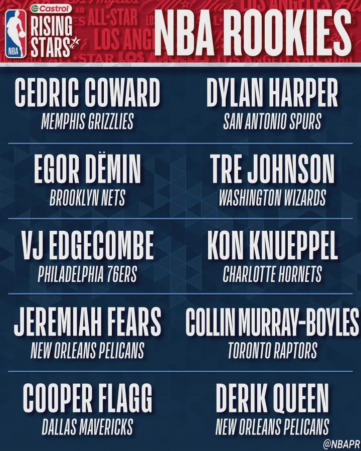 入选NBA全明星新秀赛的一年级球员,总共有10人,分别是弗拉格(独行侠)、克尼佩尔(黄蜂)、埃奇库姆(76人)、科沃德(灰熊)、奎因(鹈鹕)、特雷-约翰逊(奇才)、哈珀(马刺)、博伊尔斯(猛龙)、杰明(篮网)和费尔斯(鹈鹕)。